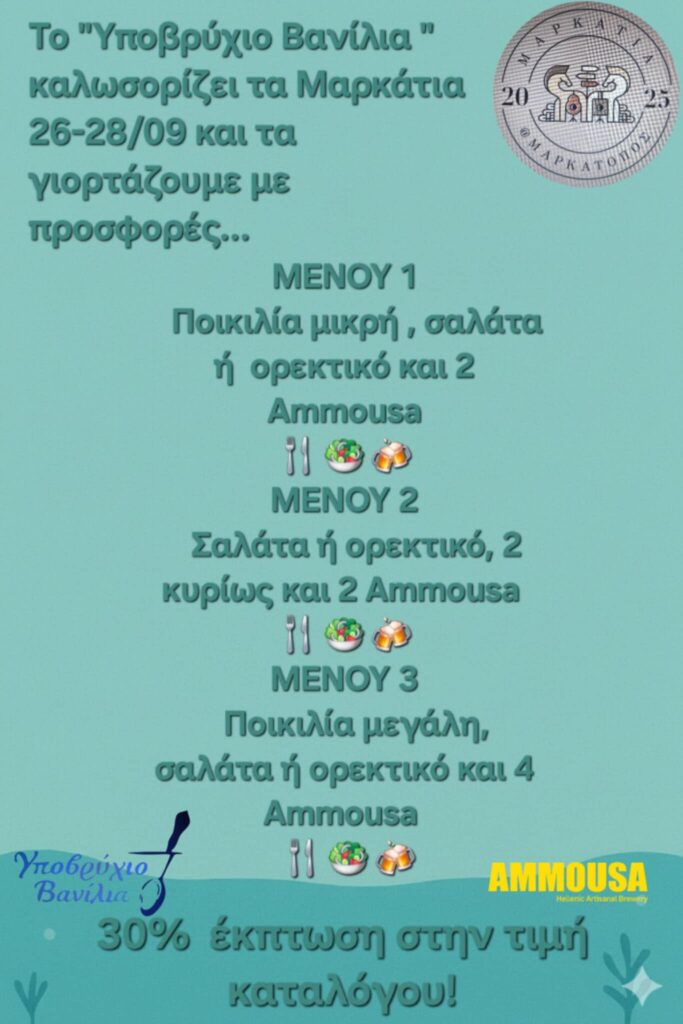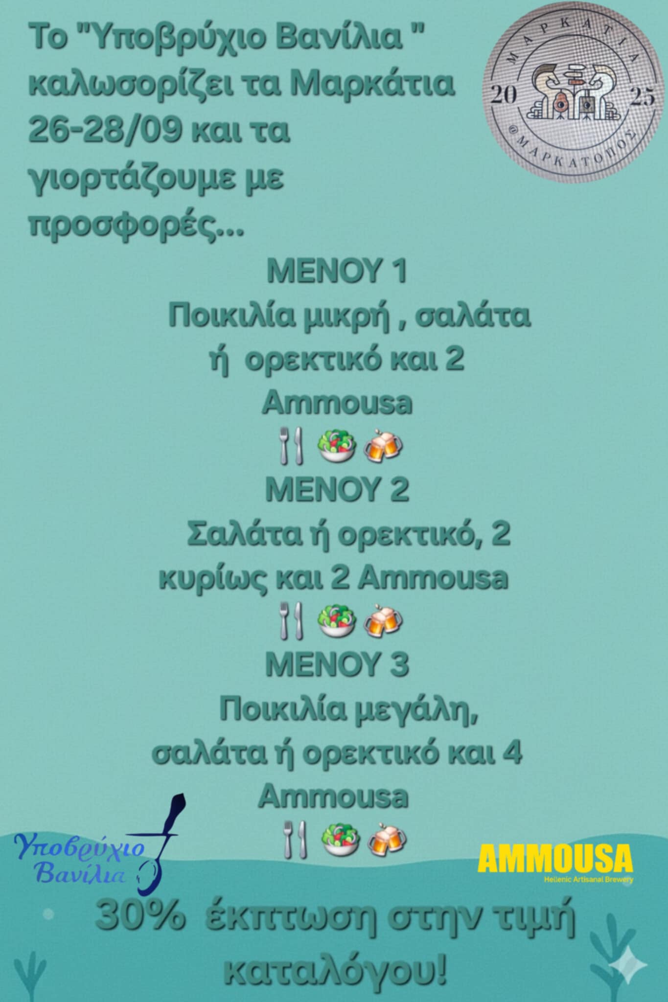 – Στο καφέ – εστιατόριο «Βανίλια-Υποβρύχιο» (πλ. Μαρκάτου), 30% έκπτωση σε συγκεκριμένες παραγγελίες, όταν συνοδεύονται με μπύρα AMMOUSA